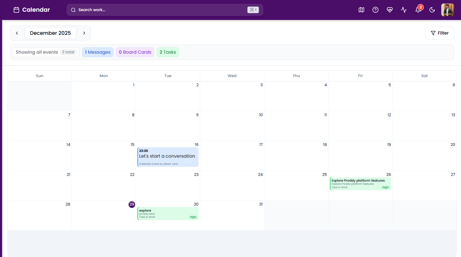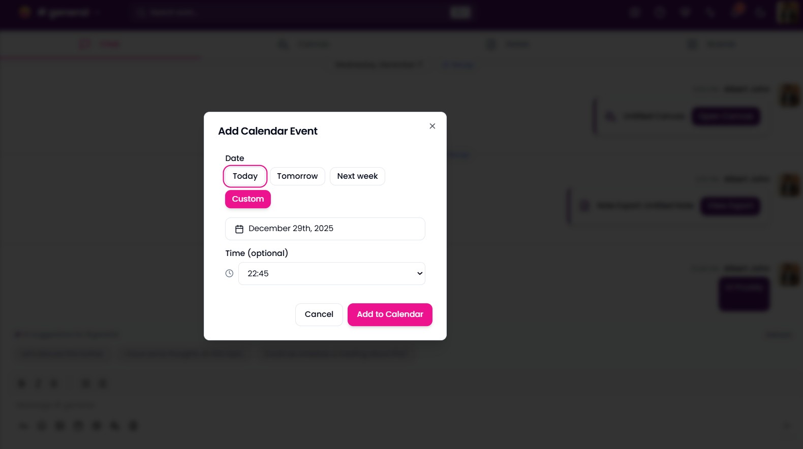 Proddy allows you to create calendar events directly from chat messages, making it easy to schedule conversations, reminders, or follow-ups without leaving the chat.Create a calendar event from chat